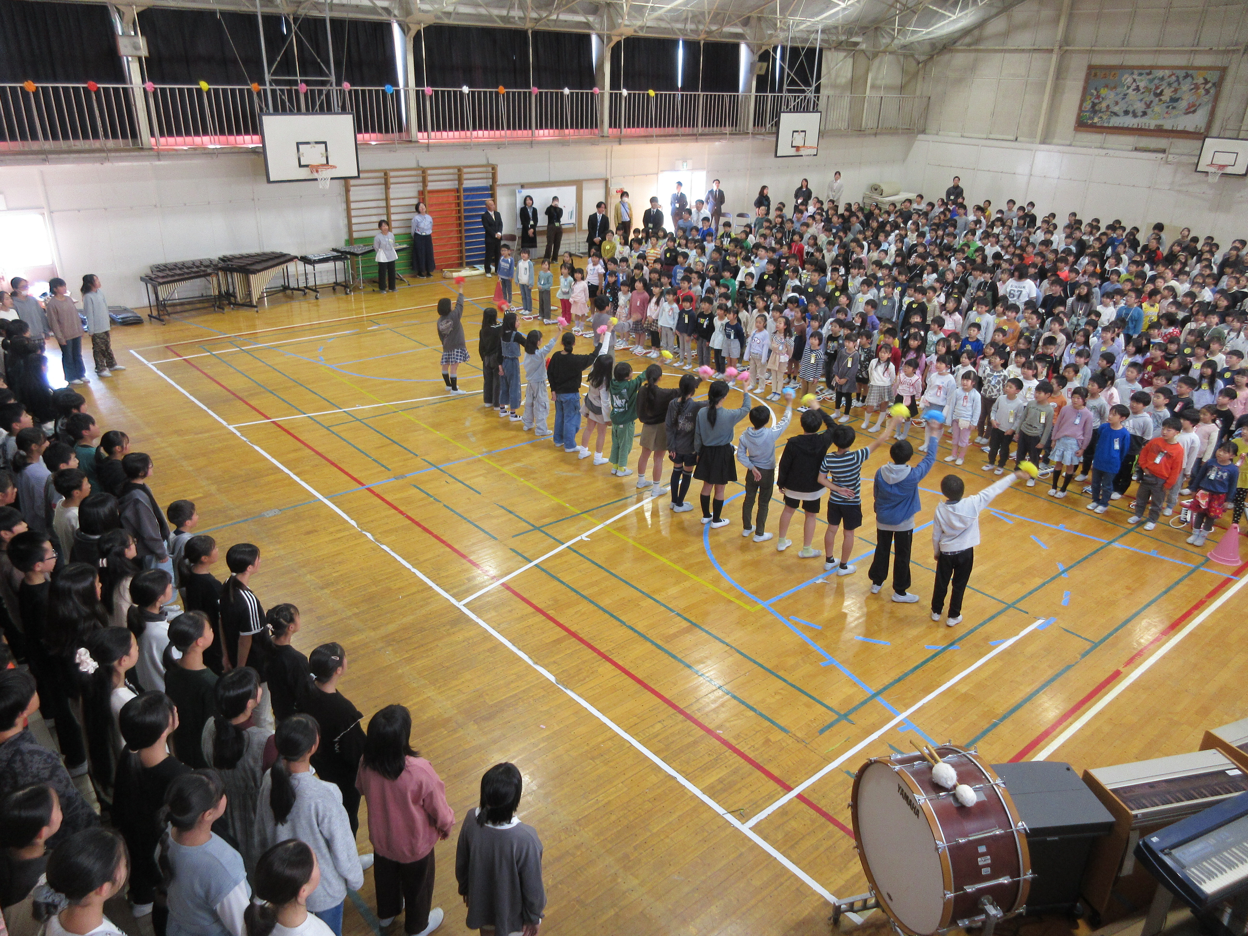 入学した1年生を歓迎する会が行われ、○×クイズや校歌などを全校で楽しみました。1年生の児童は嬉しそうにはにかんだり、楽しそうに満面の笑みを浮かべたりしていました。2年生以上の児童は、お兄さん・お姉さんらしい優しくも凛々しい表情で温かく歓迎していました。