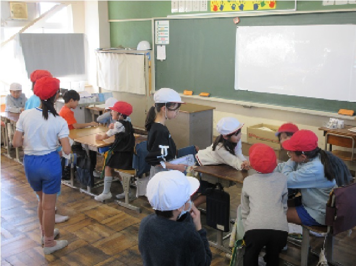 竜巻発生等の有事に備えて簡易避難場所(シェルター)をつくり、安全に避難行動をとる訓練を行いました。児童は、担任の指示のもと速やかにシェルターをつくることができました。