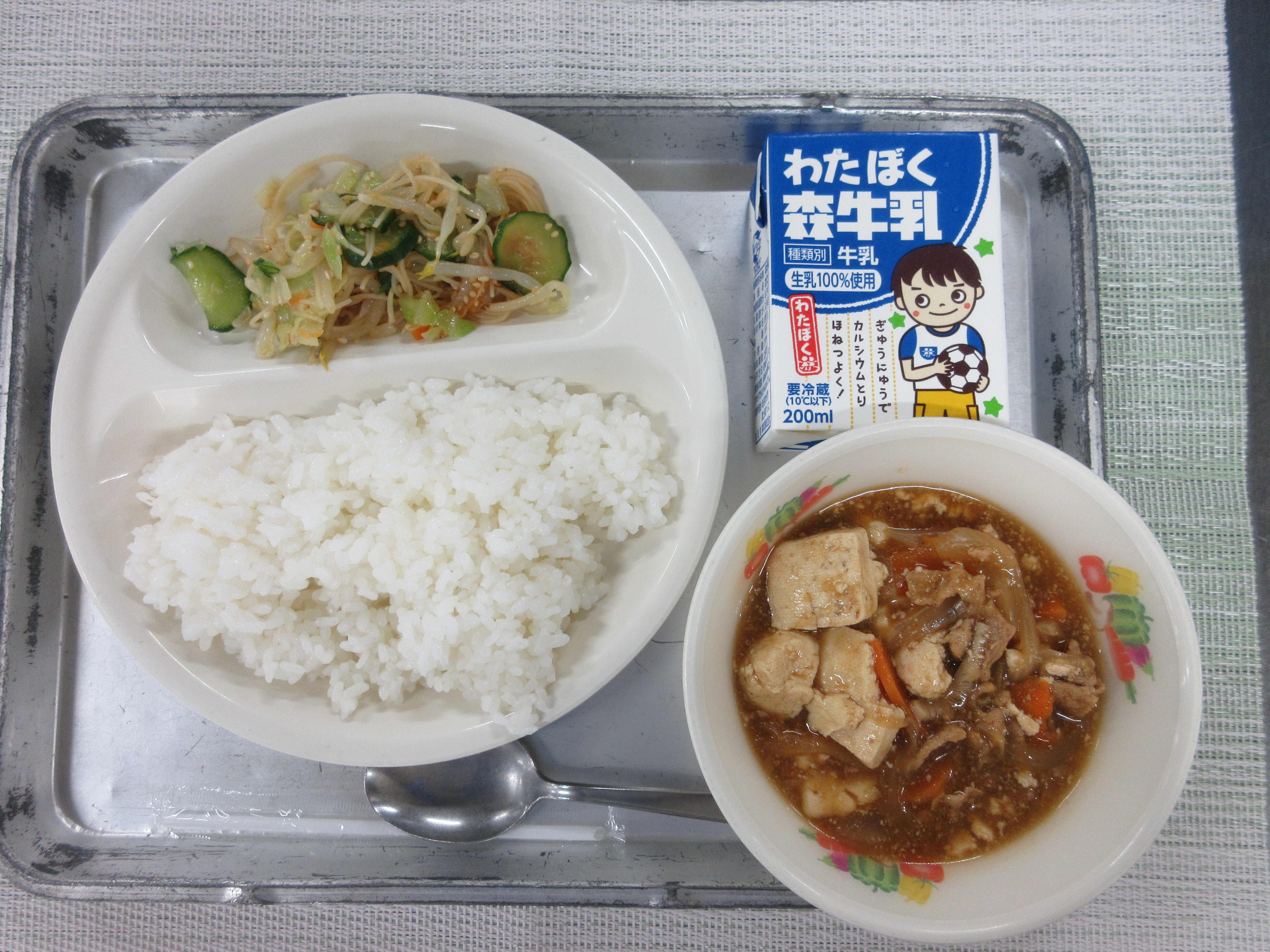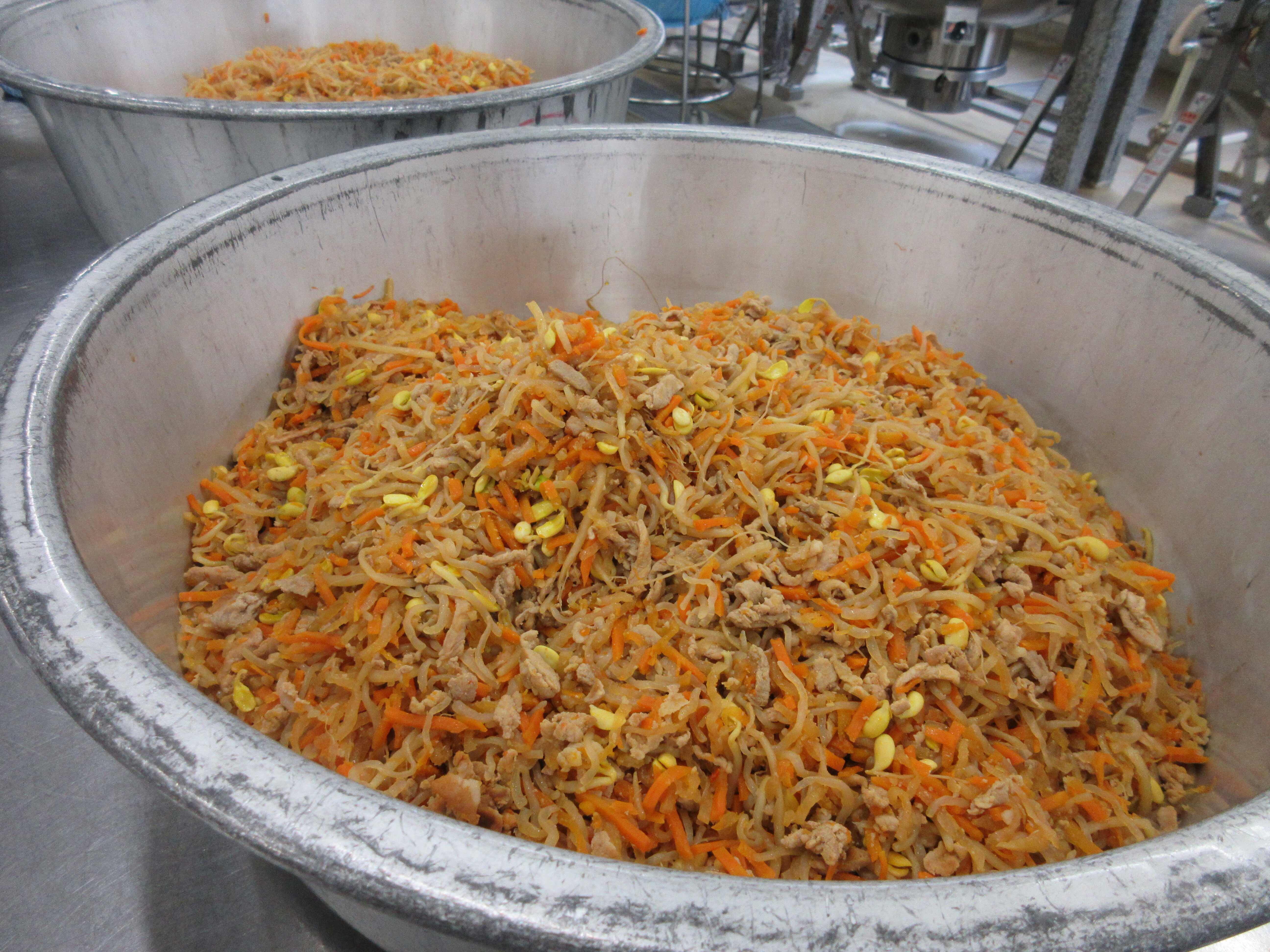 ↑韓国風炊き込みごはんの具です。大豆もやし、大根、しらたき、豚肉を豆板醤などの調味料で炒め、釜で炊いたごはんと混ぜました。新メニューでしたがどのクラスもよく食べていました。
