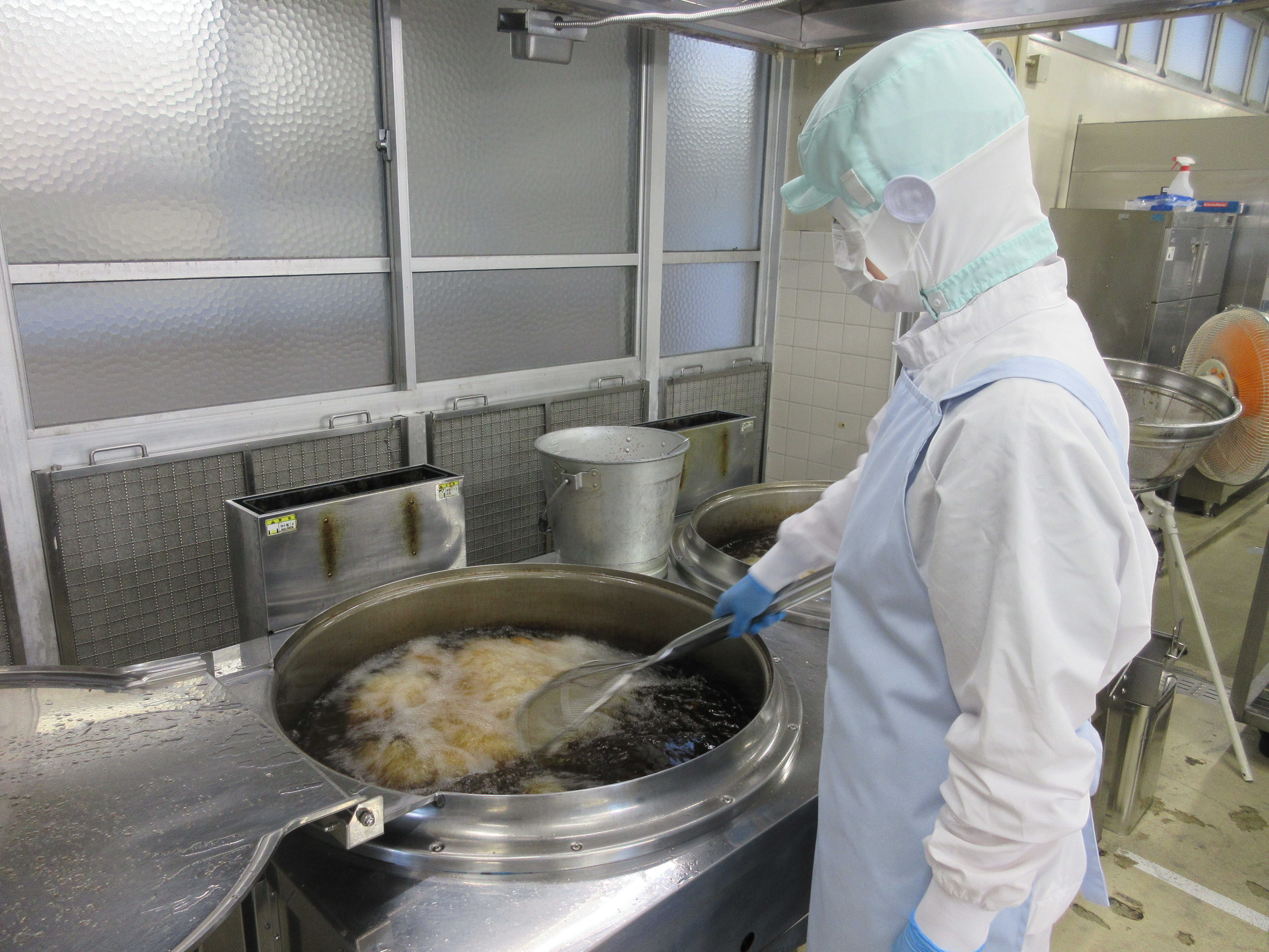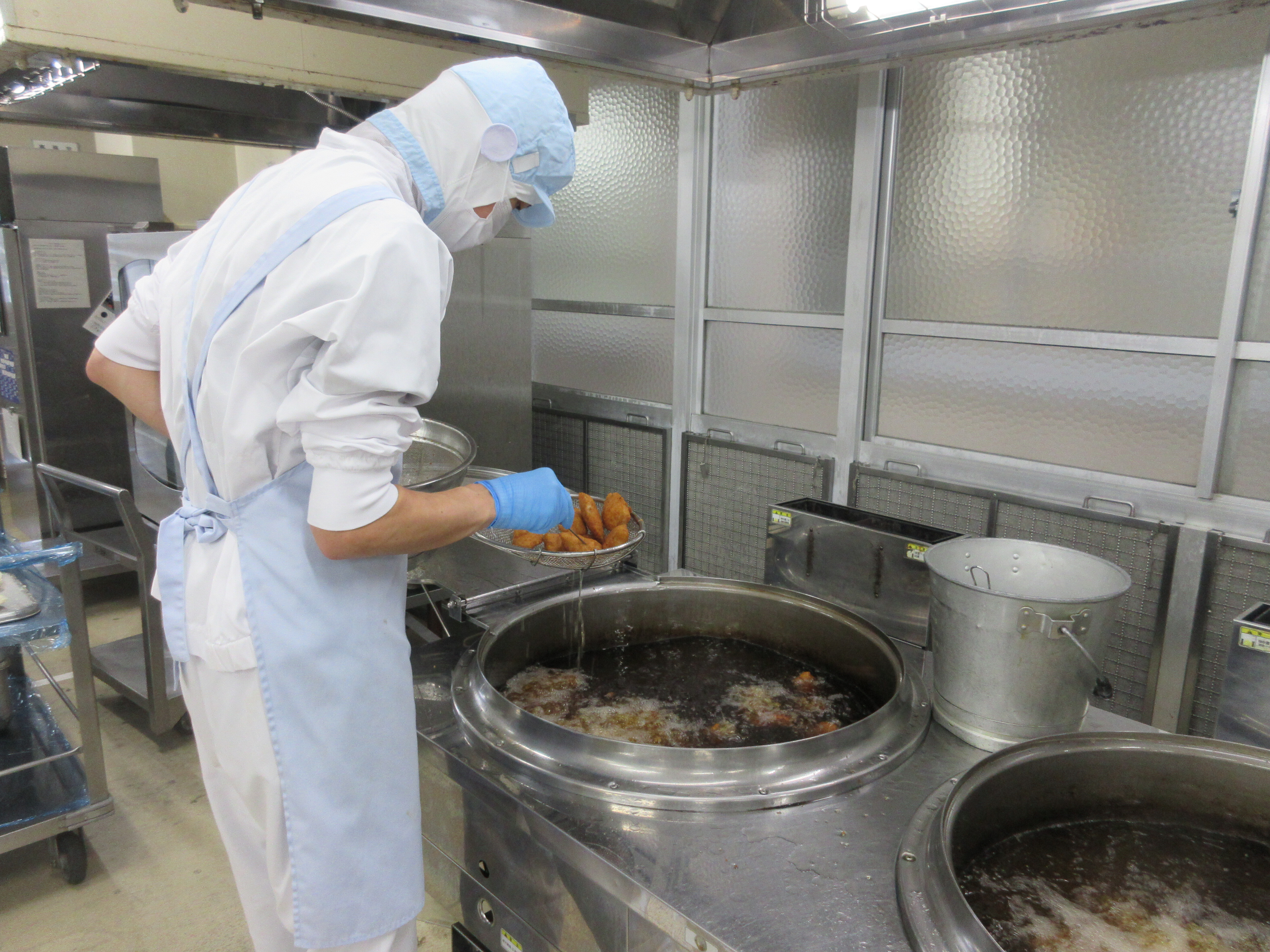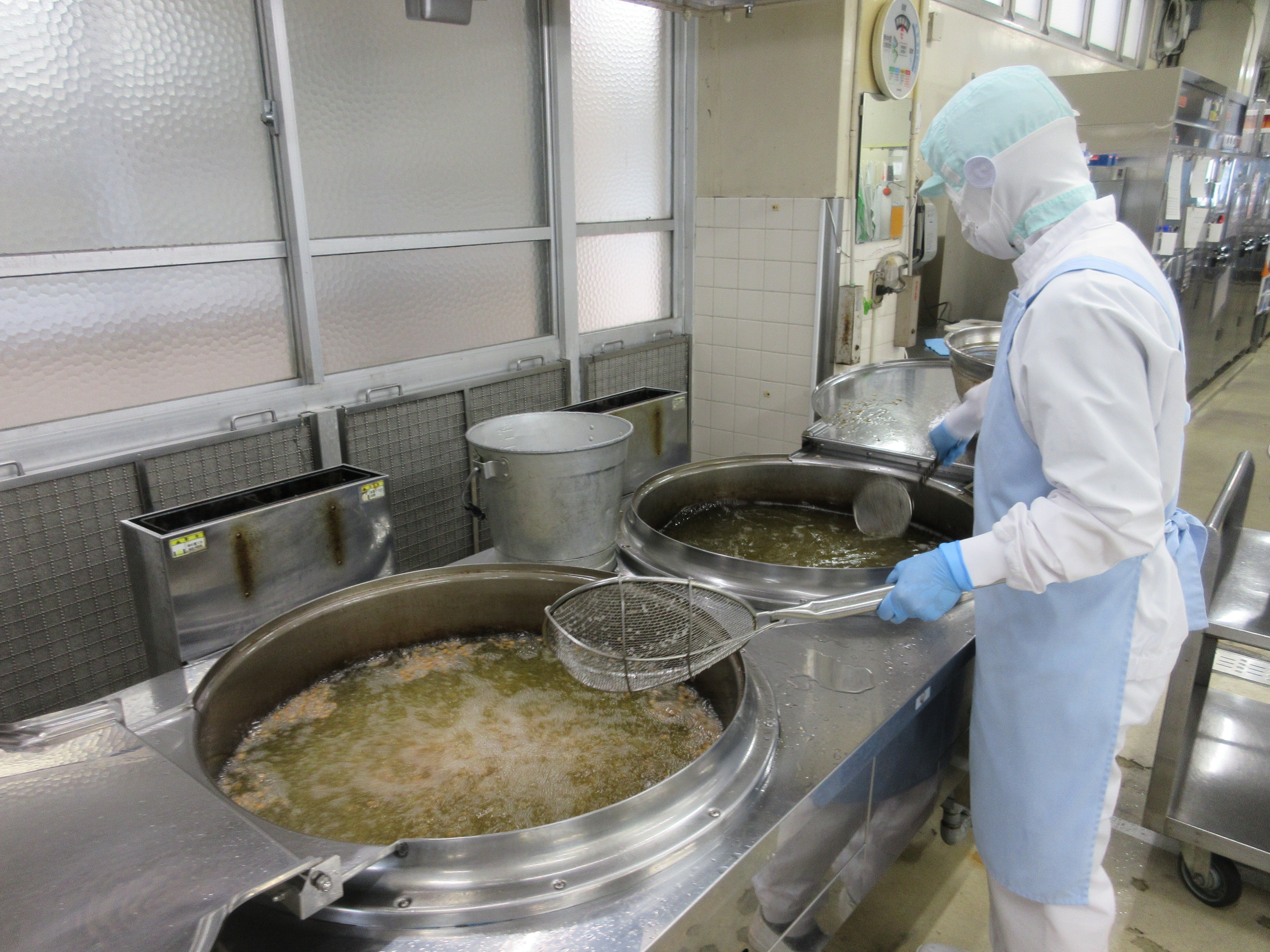 ↑かりんとうを作っている様子です。さつまいもは食べやすい大きさに切ってから油で揚げました。白いんげん豆はでん粉をまぶして油で揚げ、調味料を煮立てた甘いタレで和えました。