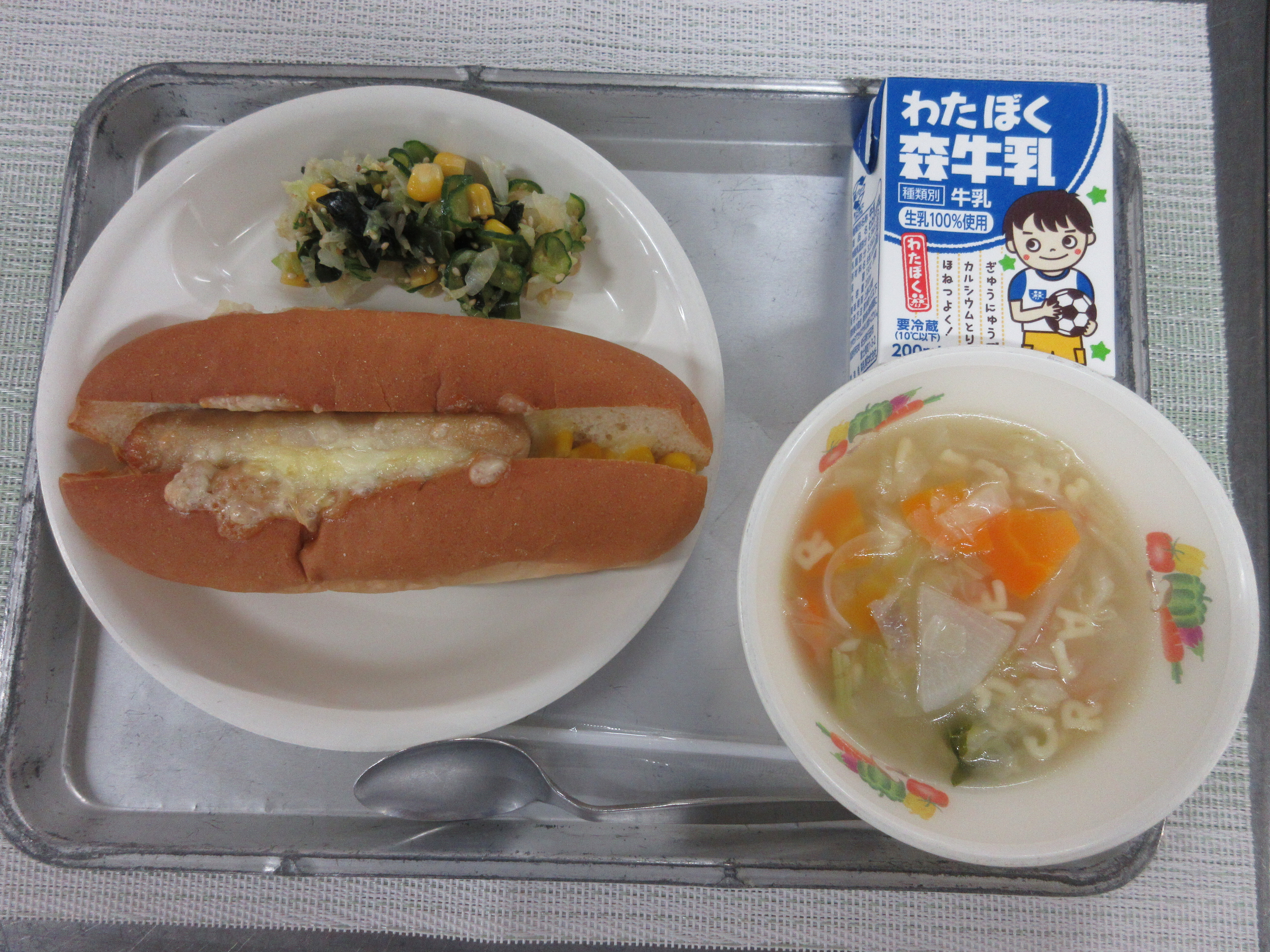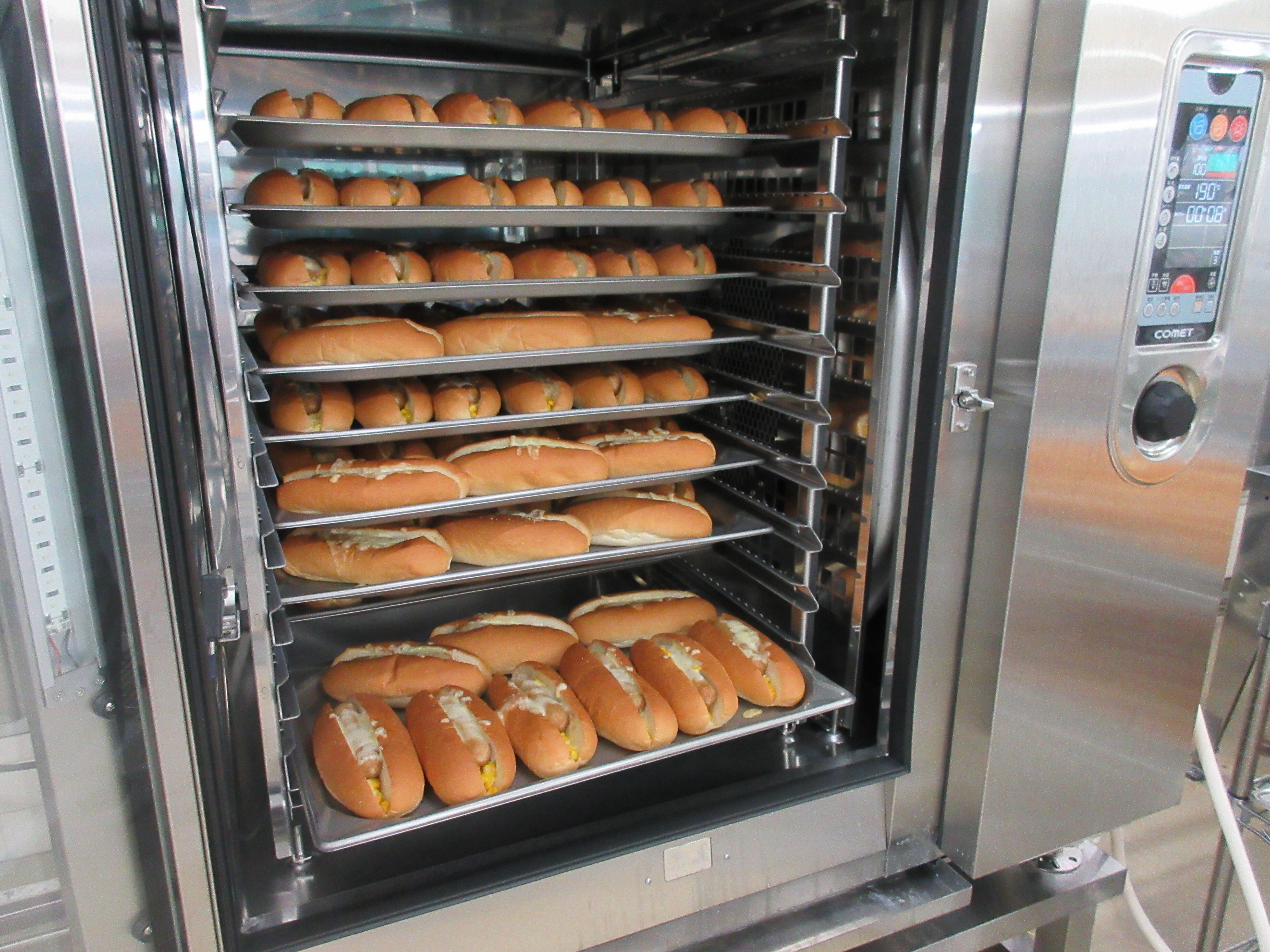 ↑マーガリンで炒めたコーンをコッペパンに挟み、その上に蒸したフランクフルト、チーズをのせて