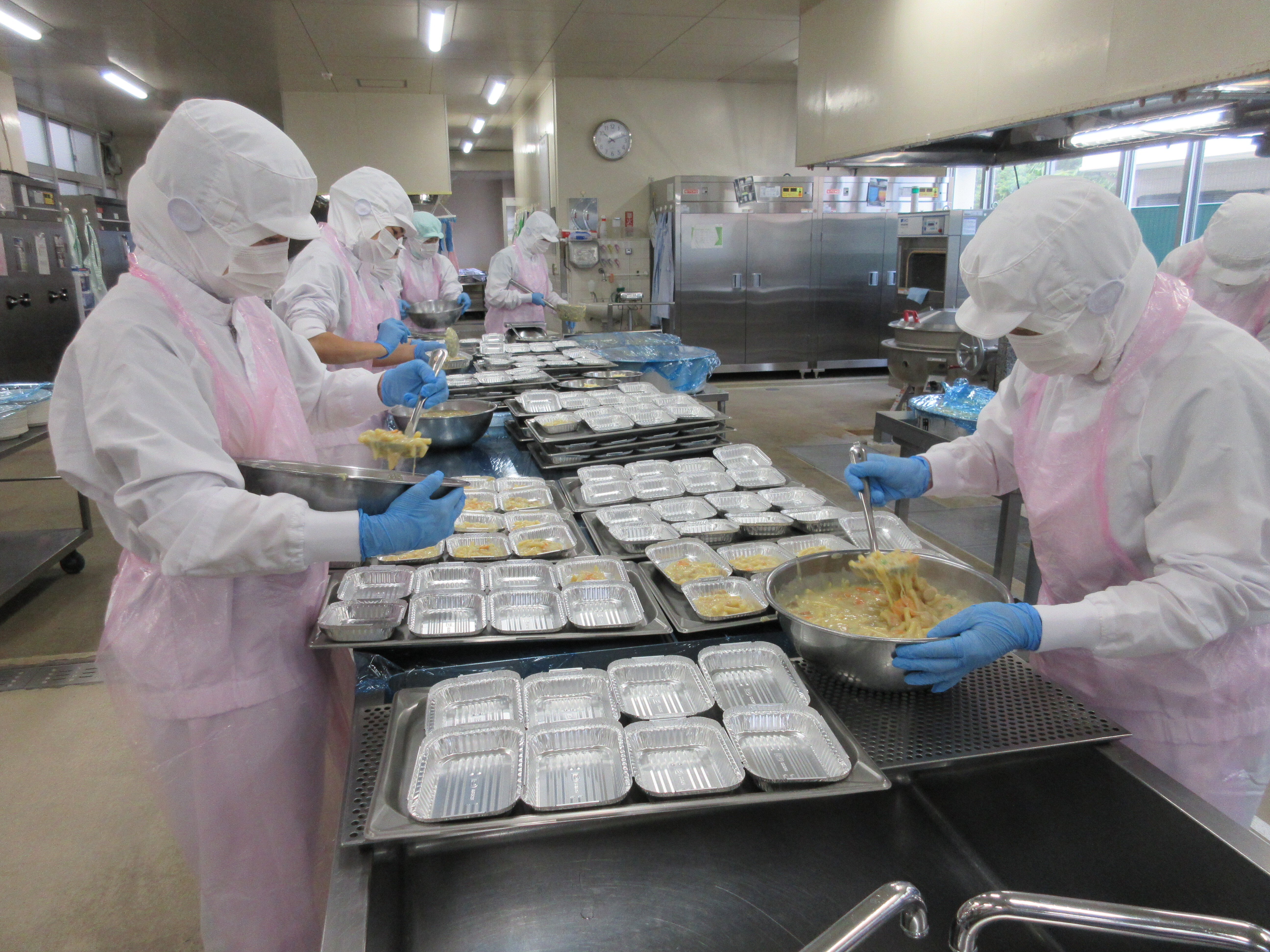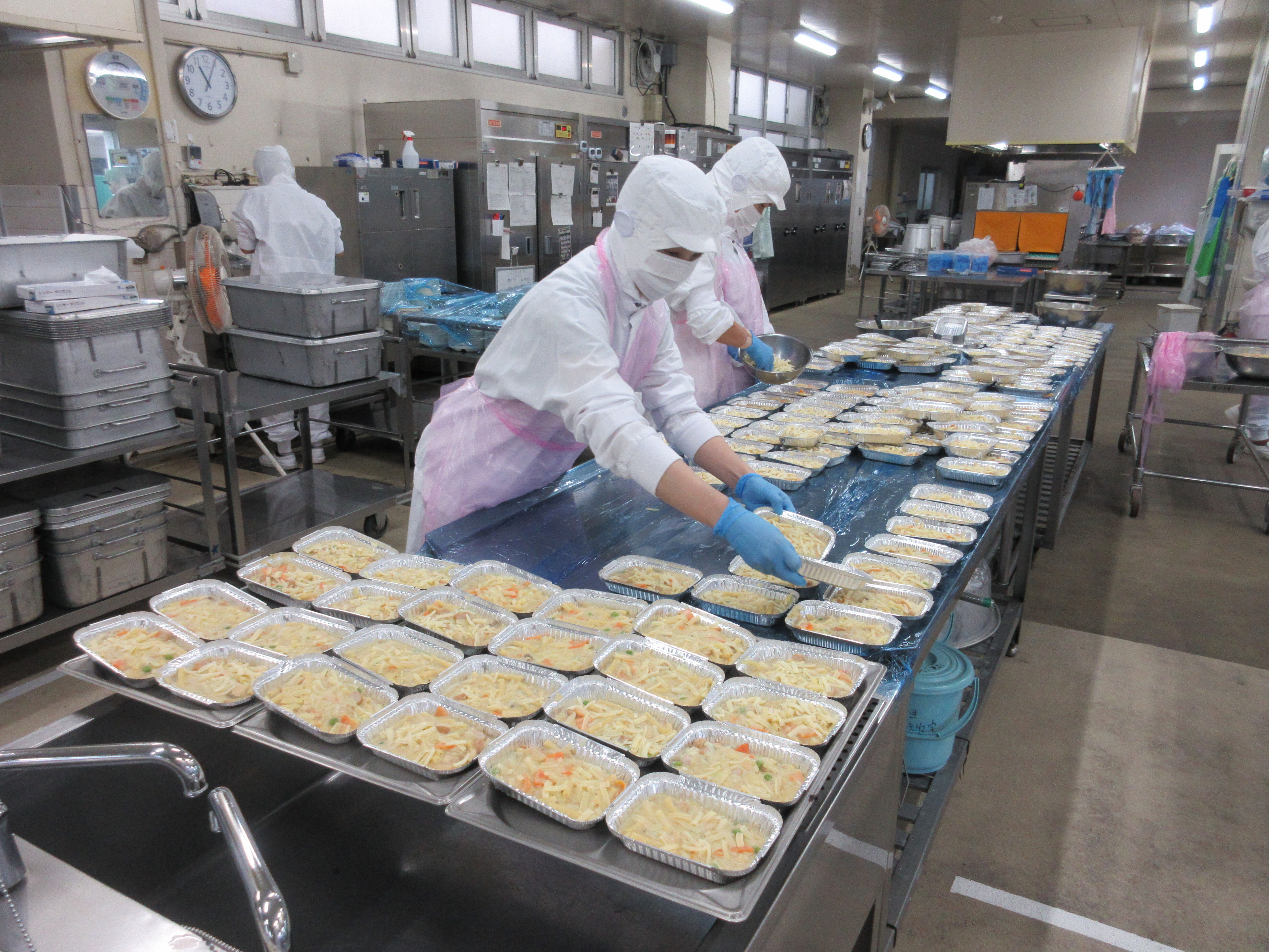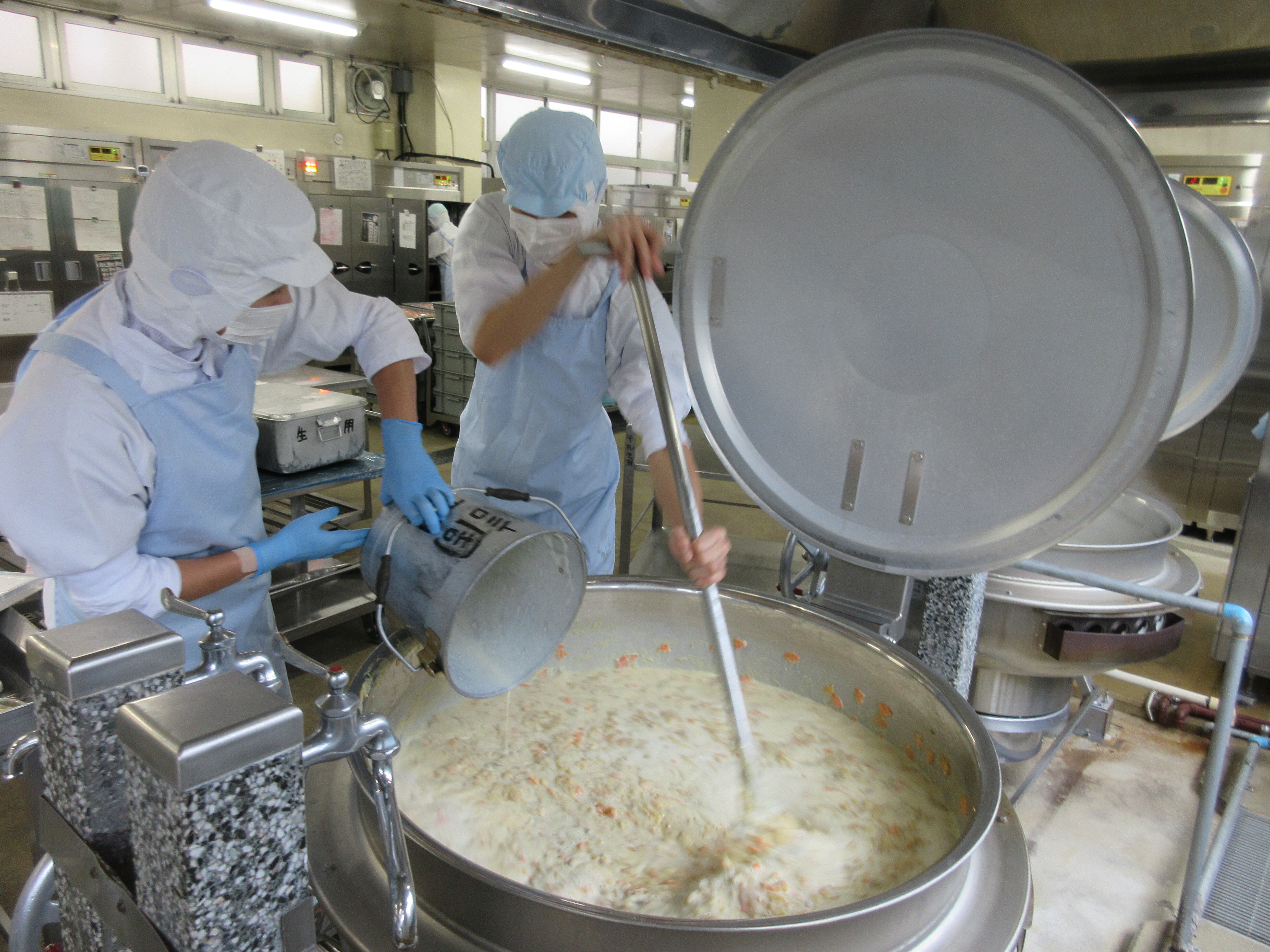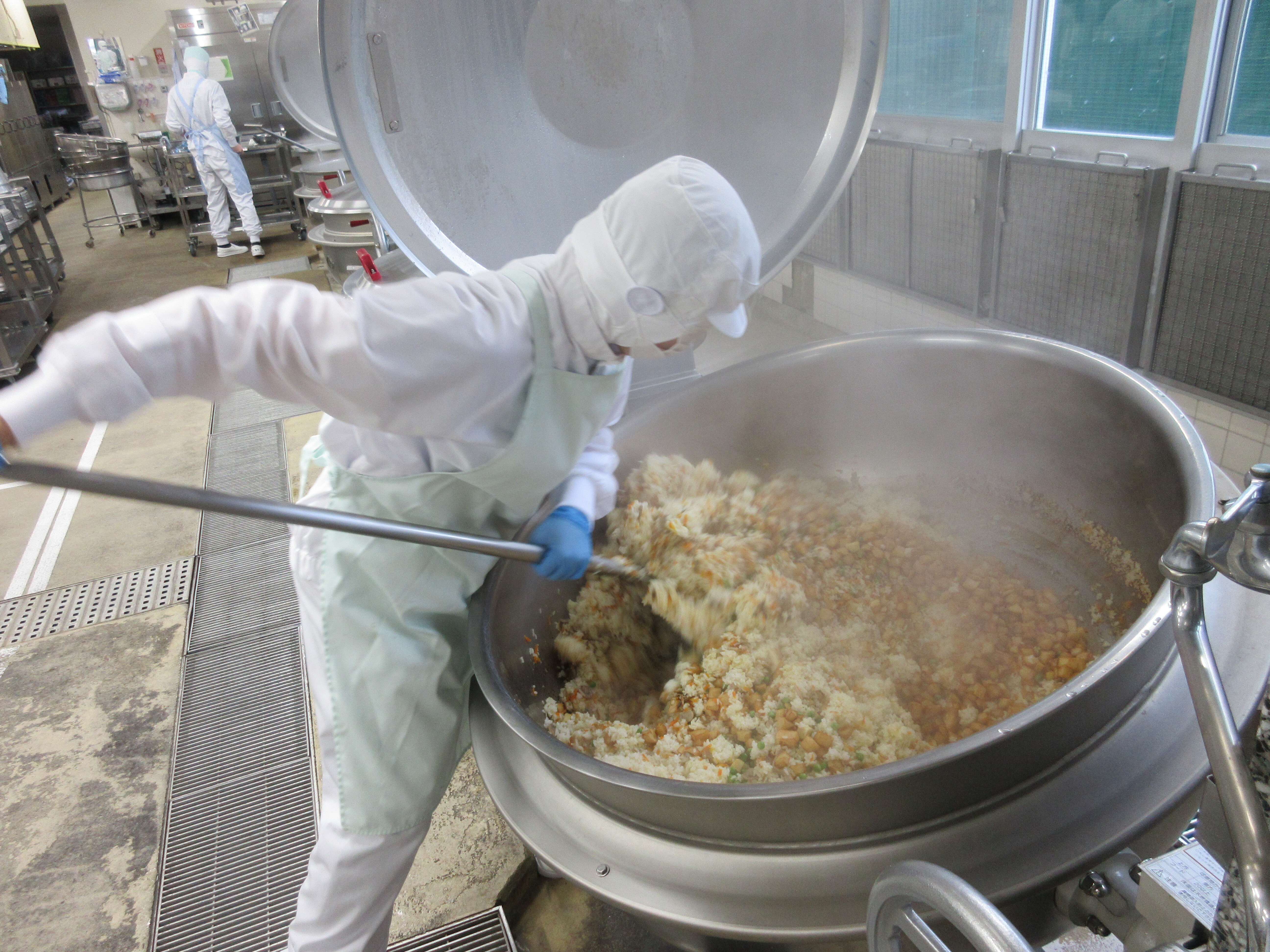 ↑ピラフは、釜で炊いたご飯に具と揚げたじゃがいもを混ぜて配缶しました。