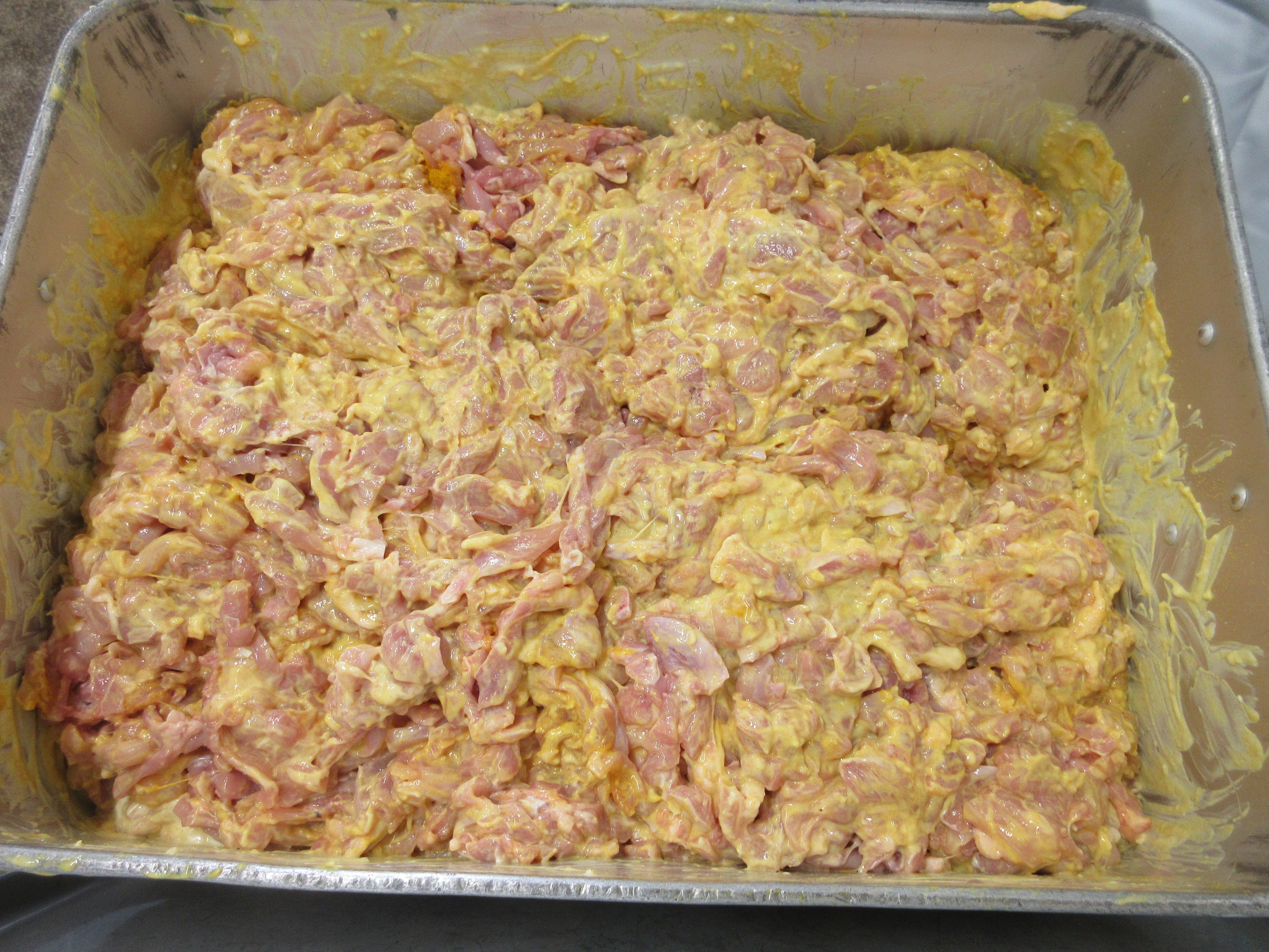 ↑バターチキンカレーの鶏肉はヨーグルト、にんにく、しょうが、ターメリック、塩で下味をつけました。