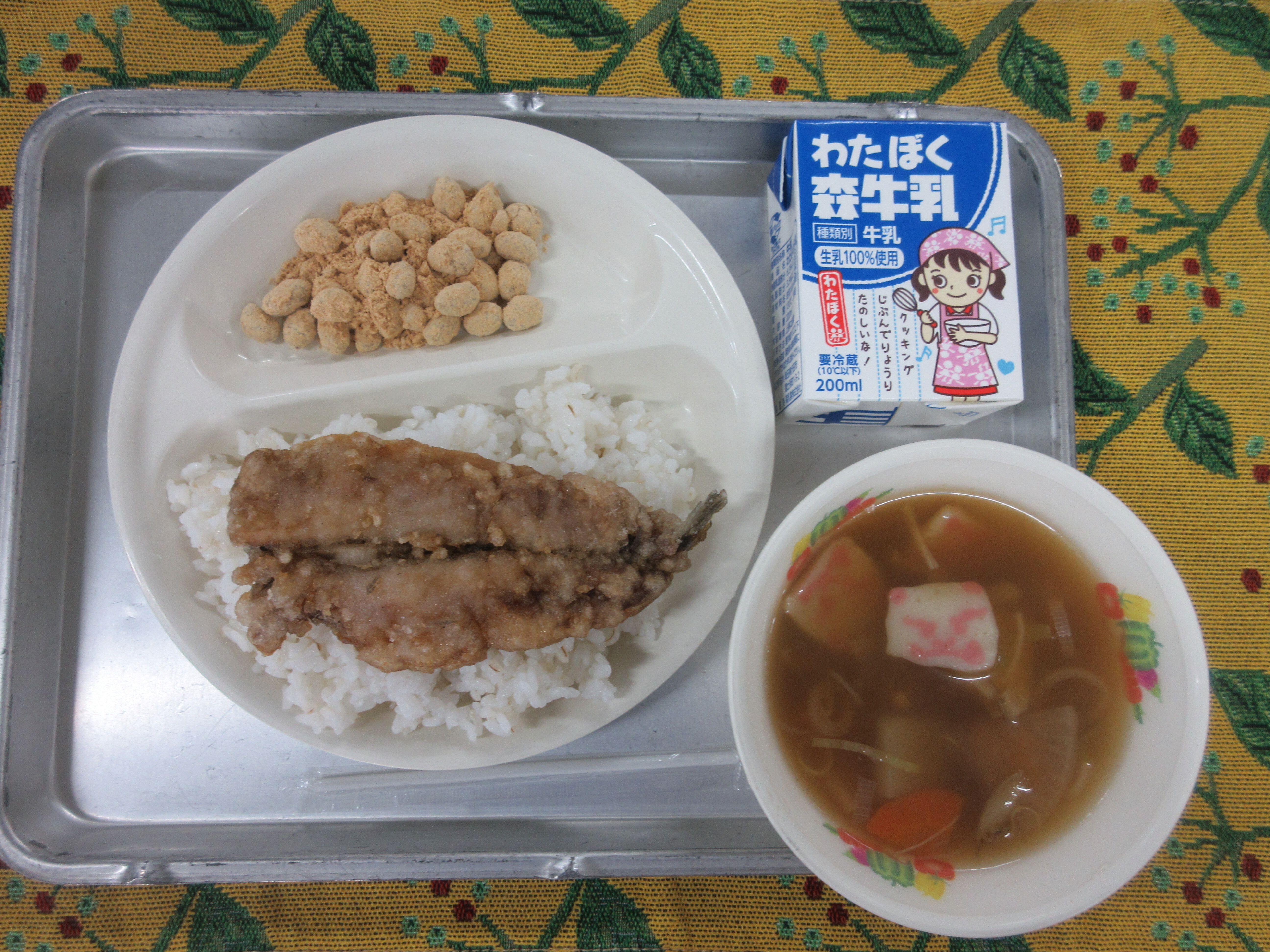 ↑根菜汁の中には、鬼のかまぼこを入れています。いわしと大豆で節分献立にしました。