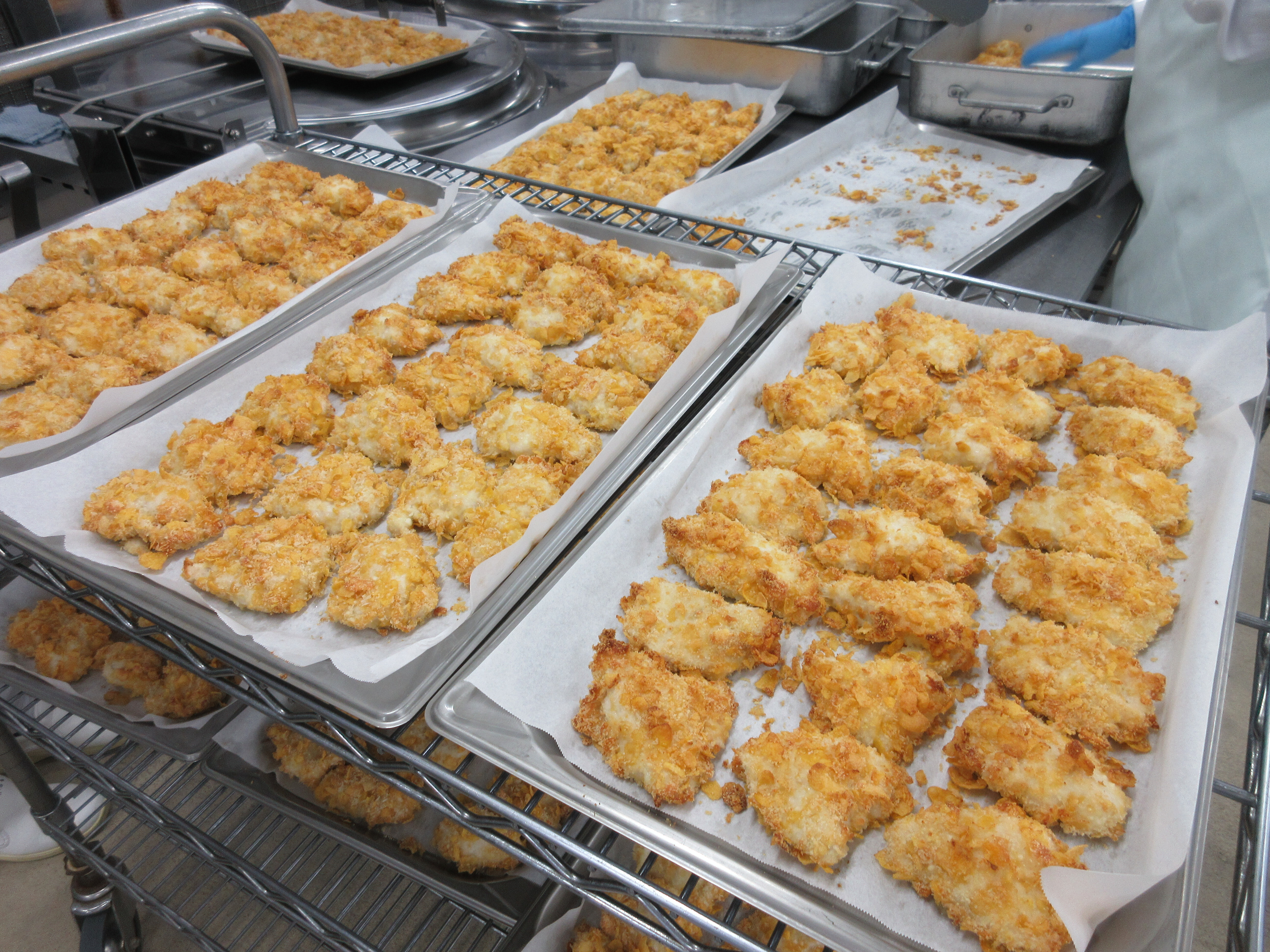 ↑下味を漬けた鶏肉にパン粉、コーンフレーク、パルメザンチーズを付けてオーブンで焼きました。人気メニューの一つです!
