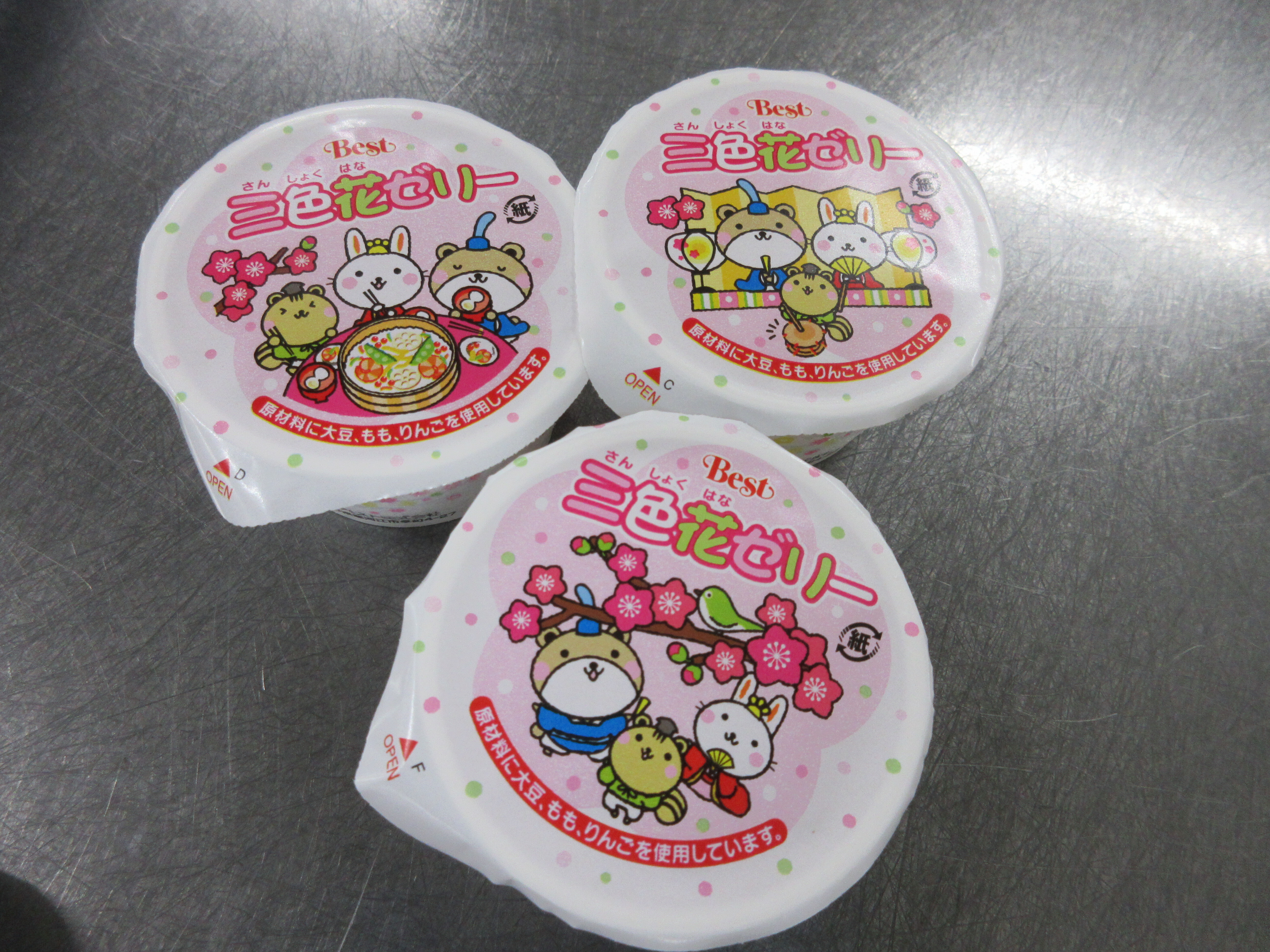 ↑すまし汁の中には手毬に見立てたお麩をいれました。菱餅に見立てたゼリーも蓋の絵が様々で喜んでいました。